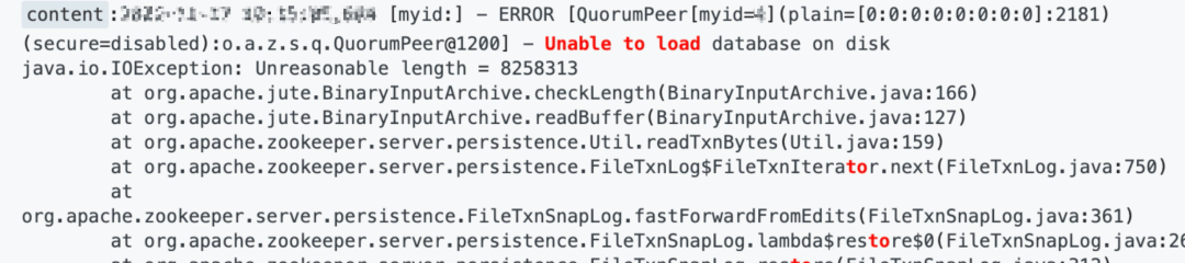 1. 在 checkLength 方法检查失败的时候会抛出异常,关键字是 Unreasonable length,同时 follower 会断开和 Leader 的连接,关键字是 Exception when following the leader,可以通过检索关键字快速确认。