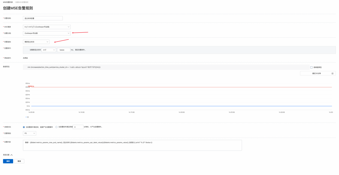 分组选择 ZooKeeper 专业版,告警项选择选主时间,然后设置阈值:
