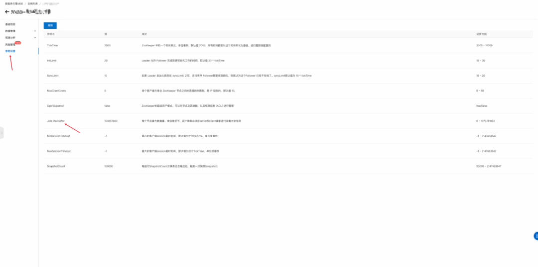 在 MSE ZooKeeper 中,可以通过控制台快捷修改 jute.maxbuffer 参数: