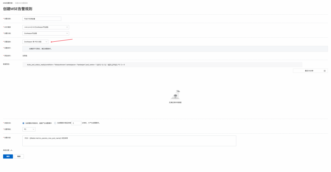 POD 状态告警,分组选择 ZooKeeper 专业版,告警项选择 ZooKeeper 单 POD 状态: