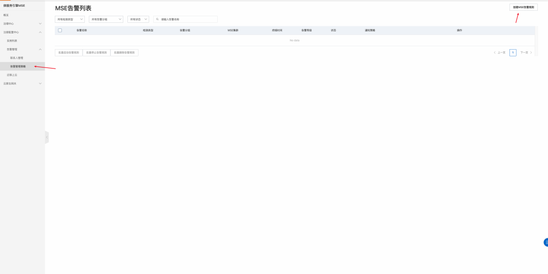 设置 MSE ZooKeeper 选主时间告警以及节点不可用告警。首先进入告警管理页面,创建新的告警: