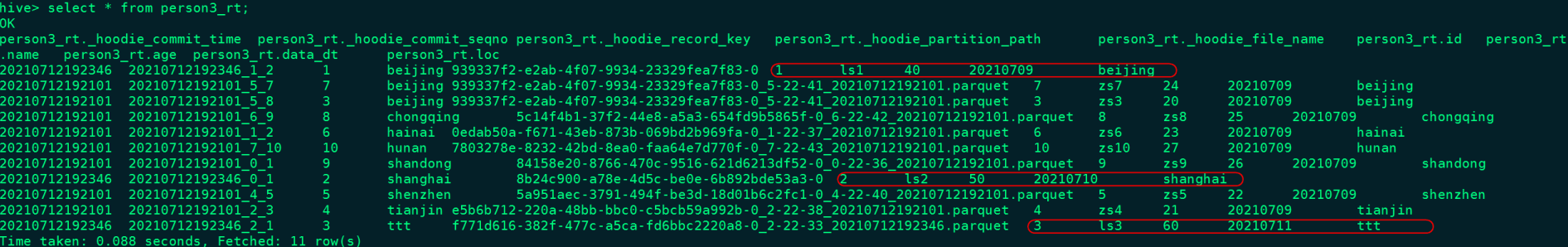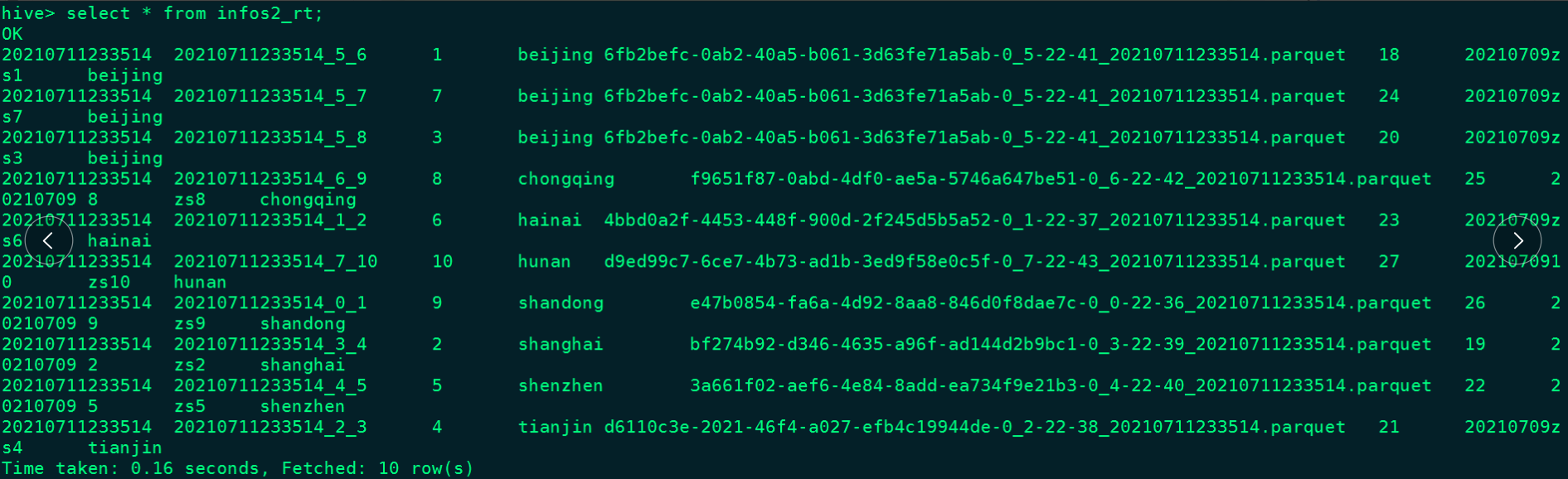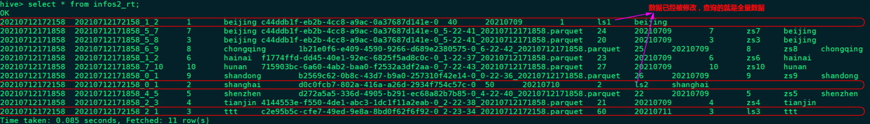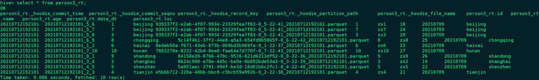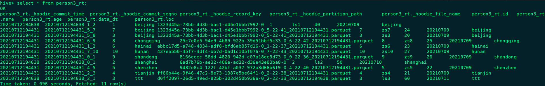 hive> select `_hoodie_commit_time`,id,name,age,loc,data_dt from infos2_rt;