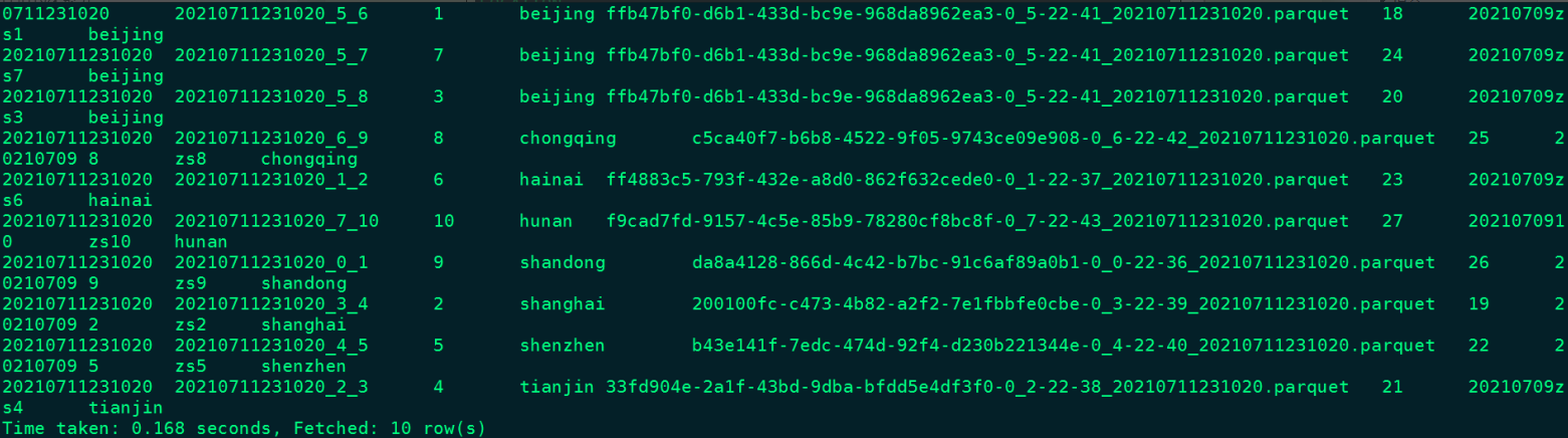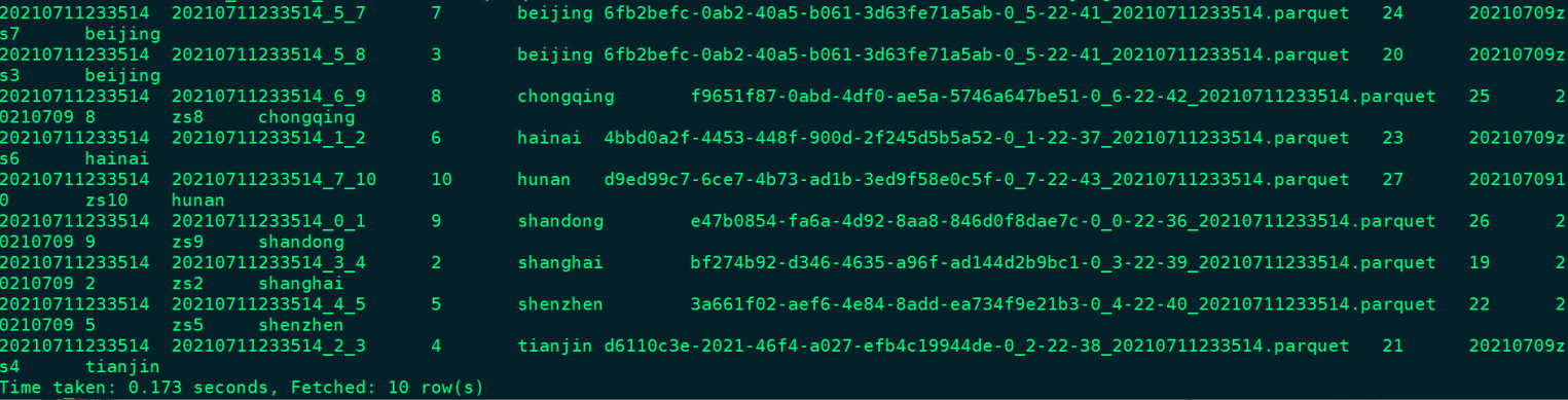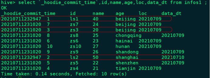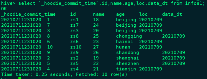 hive> select `_hoodie_commit_time`,id,name,age,loc,data_dt from infos1;