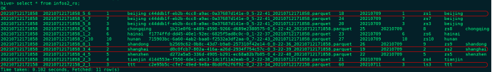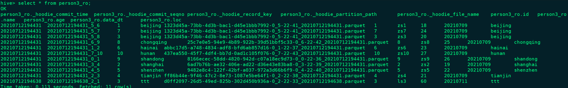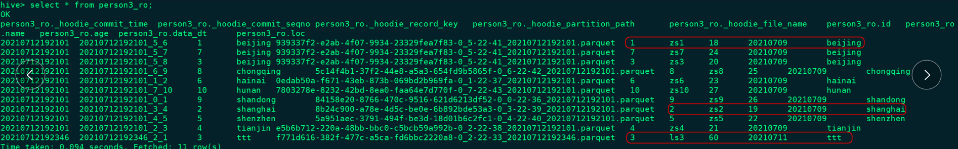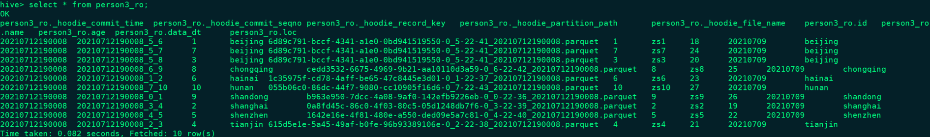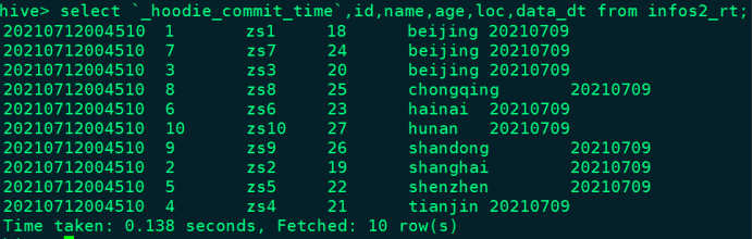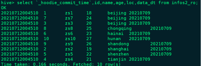hive> select `_hoodie_commit_time`,id,name,age,loc,data_dt from infos2_ro;