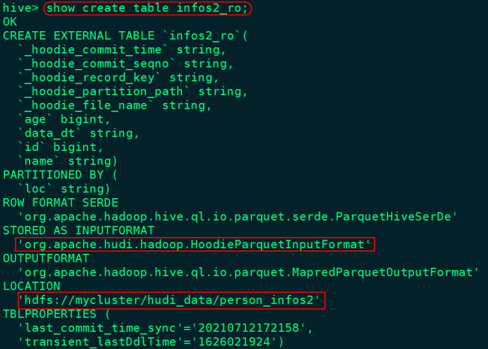 // 创建外部表,这种方式只会查询出来parquet数据文件中的内容,但是刚刚更新或者删除的数据不能查出来CREATE EXTERNAL TABLE `person3_ro`(`_hoodie_commit_time` string,`_hoodie_commit_seqno` string,`_hoodie_record_key` string,`_hoodie_partition_path` string,`_hoodie_file_name` string,`id` bigint,`name` string,`age` bigint,`data_dt` string)PARTITIONED BY (`loc` string)ROW FORMAT SERDE'org.apache.hadoop.hive.ql.io.parquet.serde.ParquetHiveSerDe'STORED AS INPUTFORMAT'org.apache.hudi.hadoop.HoodieParquetInputFormat'OUTPUTFORMAT'org.apache.hadoop.hive.ql.io.parquet.MapredParquetOutputFormat'LOCATION 'hdfs://mycluster/hudi_data/person_infos3';