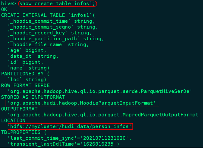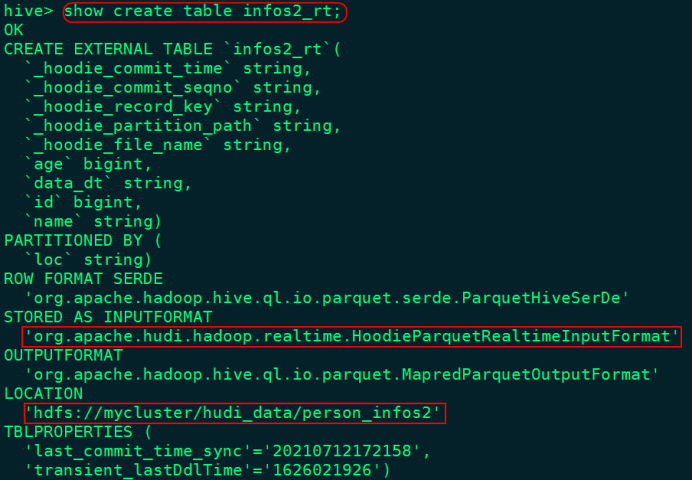 // 这种方式会将基于Parquet的基础列式文件、和基于行的Avro日志文件合并在一起呈现给用户。CREATE EXTERNAL TABLE `person3_rt`(`_hoodie_commit_time` string,`_hoodie_commit_seqno` string,`_hoodie_record_key` string,`_hoodie_partition_path` string,`_hoodie_file_name` string,`id` bigint,`name` string,`age` bigint,`data_dt` string)PARTITIONED BY (`loc` string)ROW FORMAT SERDE'org.apache.hadoop.hive.ql.io.parquet.serde.ParquetHiveSerDe'STORED AS INPUTFORMAT'org.apache.hudi.hadoop.realtime.HoodieParquetRealtimeInputFormat'OUTPUTFORMAT'org.apache.hadoop.hive.ql.io.parquet.MapredParquetOutputFormat'LOCATION 'hdfs://mycluster/hudi_data/person_infos3';