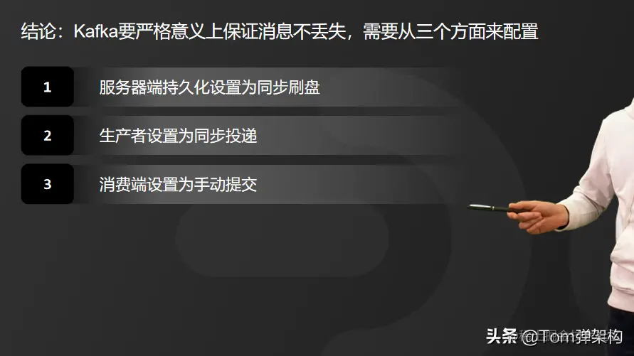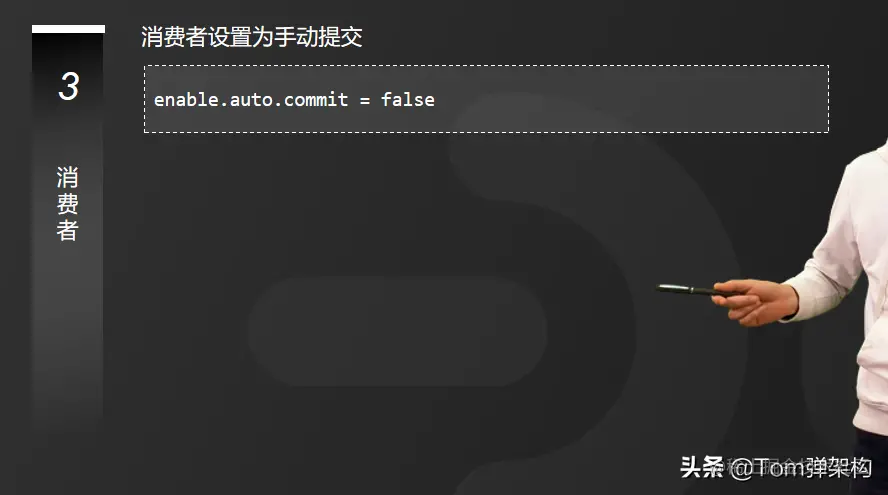 第三个,就是消费者Consume。设置enable.auto.commit为false。在Kafka中,消息消费完成之后,它不会立即删除,而是使用定时清除策略,也就是说,我们消费者要确保消费成功之后,手动ACK提交。如果消费失败的情况下,我们要不断地进行重试。所以,消费端不要设置自动提交,一定设置为手动提交才能保证消息不丢失。