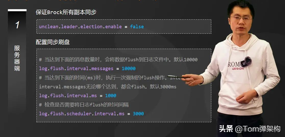 首先第一个是服务器端。设置broker中的配置项unclean.leader.election.enable = false,保证所有副本同步。同时,Producer将消息投递到服务器的时候,我们需要将消息持久化,也就是说会同步到磁盘。注意,同步到硬盘的过程中,会有同步刷盘和异步刷盘。如果选择的是同步刷盘,那是一定会保证消息不丢失的。就算刷盘失败,也可以即时补偿。但如果选择的是异步刷盘的话,这个时候,消息有一定概率会丢失。网上有一种说法,说Kafka不支持同步刷盘,这种说法也不能说是错的。但是可以通过参数的配置变成同步刷盘,比如,这样的配置: