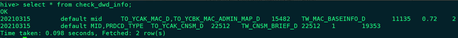 #登录Hive ,切换data_quality库,查询数据select * from check_dwd_info;