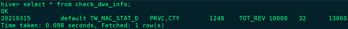 #登录Hive ,切换data_quality库,查询数据select * from check_dws_info;