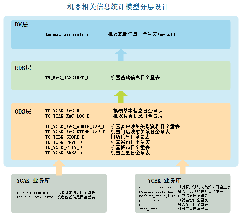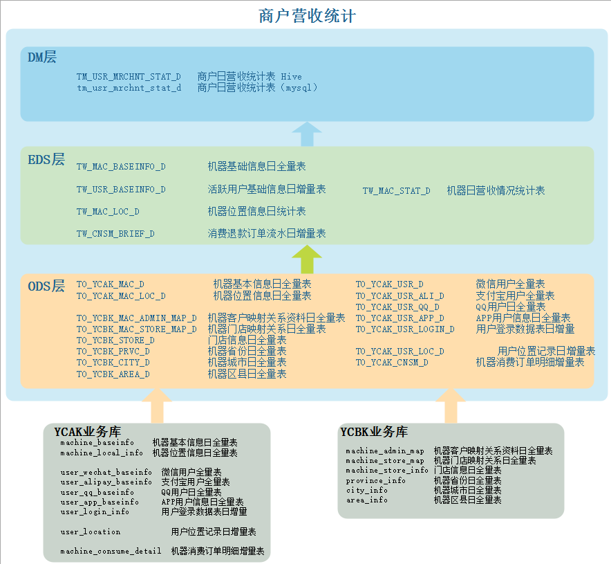 ODS层:TO_YCAK_USR_LOC_D :用户位置记录日增量表 【增量导入】TO_YCAK_CNSM_D :机器消费订单明细增量表 【增量导入】TO_YCAK_MAC_D :机器基本信息日全量表 【全量导入】TO_YCAK_MAC_LOC_D :机器位置信息日全量表 【全量导入】TO_YCBK_MAC_ADMIN_MAP_D :机器客户映射关系资料日全量表 【全量导入】TO_YCBK_MAC_STORE_MAP_D :机器门店映射关系日全量表 【全量导入】TO_YCBK_STORE_D :门店信息日全量表 【全量导入】TO_YCBK_PRVC_D :机器省份日全量表 【全量导入】TO_YCBK_CITY_D :机器城市日全量表 【全量导入】TO_YCBK_AREA_D :机器区县日全量表 【全量导入】TO_YCAK_USR_ALI_D :支付宝用户全量表 【全量导入】TO_YCAK_USR_D :微信用户全量表 【全量导入】TO_YCAK_USR_QQ_D :QQ用户日全量表 【全量导入】TO_YCAK_USR_APP_D :APP用户信息日全量表 【全量导入】TO_YCAK_USR_LOGIN_D :用户登录数据表日增量 【增量导入】EDS层:TW_MAC_LOC_D - 机器位置信息日统计表TW_CNSM_BRIEF_D - 消费退款订单流水日增量表TW_MAC_BASEINFO_D - 机器基础信息日全量表 【第二个业务】TW_USR_BASEINFO_D - 活跃用户基础信息日增量表 【第三个业务】TW_MAC_STAT_D - 机器日营收情况统计表DM层:TM_USR_MRCHNT_STAT_D - 商户日营收统计表