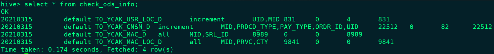 #登录Hive ,切换data_quality库,查询数据select * from check_ods_info;