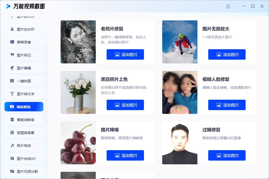 手动修复虽然精细,但太费时间了,要是一次要修复好几张照片,根本忙不过来!后来我发现了「万能视频截图」这款电脑端工具,本来是用来截视频画面的,没想到它的老照片修复功能直接封神!打开软件后,在主界面找到【画质修复】栏目,点击添加之前处理好的扫描件,不管是照片上的划痕、污渍,还是整体泛黄,软件都能智能识别并修复,不用自己一点点抠细节。