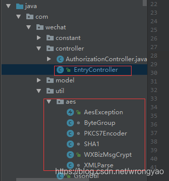 2、项目结构,添加微信的加密解密包,下图aes包下的内容,另外需要添加code依赖