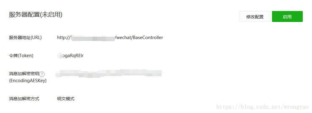 依此填写三个参数,url需要接入的接口,token和EncodingAESkey,后面两个必须和自己项目上写的保持一致
