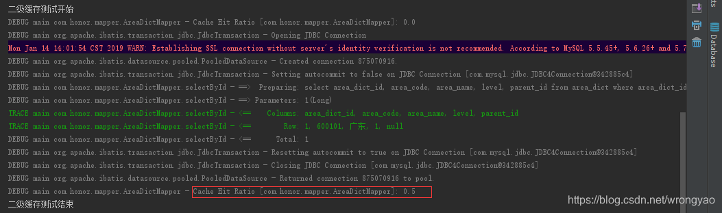 上述红框中的cache hit ratio表示缓冲命中率,表示从缓存中取数据的次数占总次数的比例,这边一共需要发两次sql,从缓存中取了一次,所以占比0.5