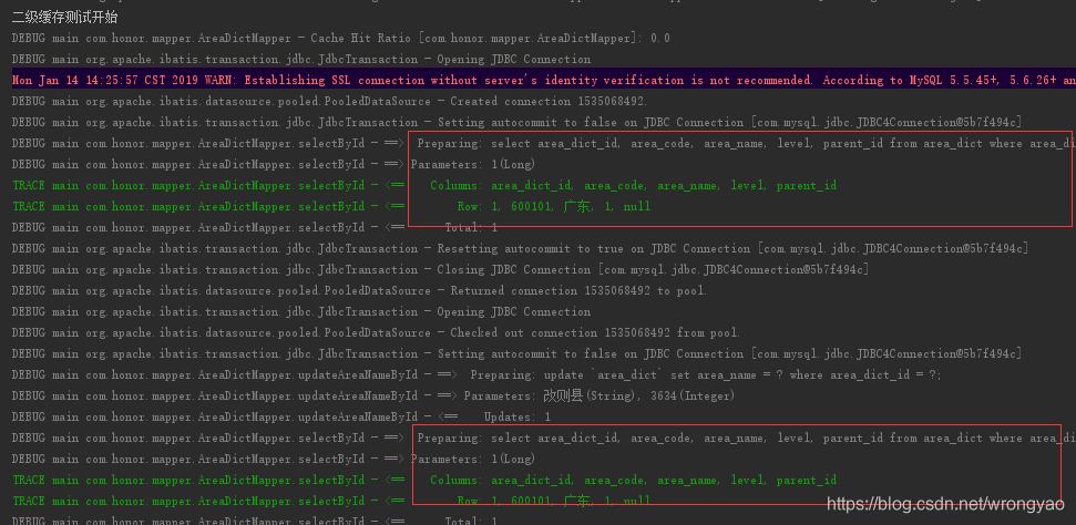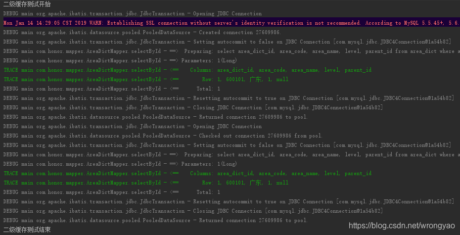 测试代码:开启二个sqlsession,两次执行一样的查询sql