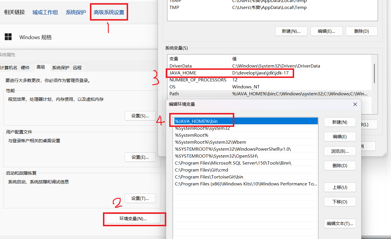 先Win+E打开资源管理器--->右键点击此电脑--->点击属性--->点击高级系统设置--->点击环境变量-->在系统变量右下方点击新建一个变量并命名为JAVA_HOME,变量的值为JDK的目录路径--->创建好了之后,点击Path,进入之后删除JDK下载时自动配置的bin目录路径,将其改为:%JAVA_HOME%bin--->最后点击所有的确定