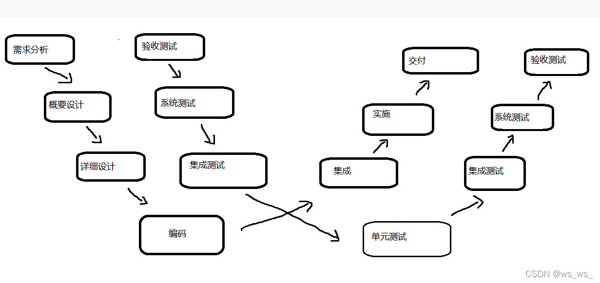 V 模型的左边下降的是开发过程各阶段,与此相对应的是右边上升的部分,即各测试过程的各个阶段。
