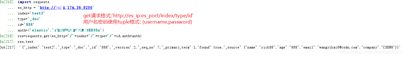 res=requests.get(es_http+'/'+index+'/'+type+'/'+id,auth=auth) #如果没有安全认证则不需要auth参数