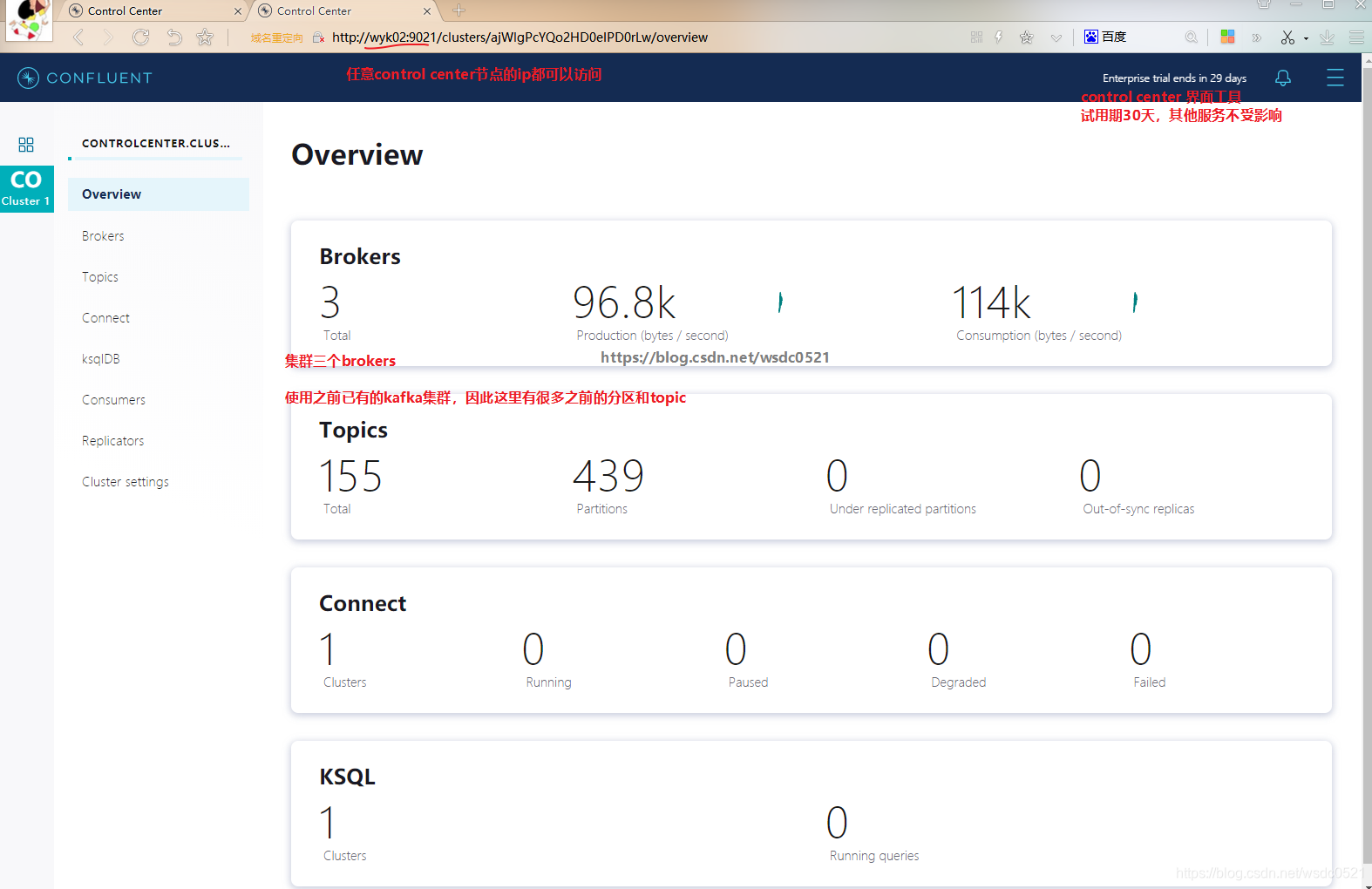 全部启动成功后,在浏览器中输入任意control center节点的ip:9021 即可进入管理界面: