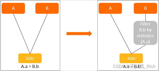 如图所示,两表join,其中A为小表,B为大表,依据A表的key生成filter,推送至shuffle/join之前,提前过滤B表(大表)的数据量,可以减少B表shuffle的数据量从而提高性能。