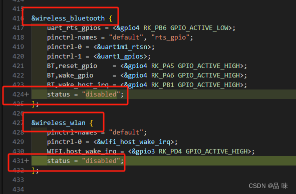 首先在主设备树中可以找到关于WIFIBT的设备节点有两个,一个是WIFI的,一个是蓝牙的。这两个节点是分开的,其状态是okay,我在这里把它们改写为“disabled”,如下图: