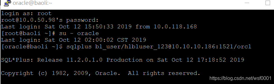 8. linux服务器上登录数据库命令。1.su - oracle ; 2. sqlplus 用户名/密码@10.10.10.186:1521/orcl,例如: