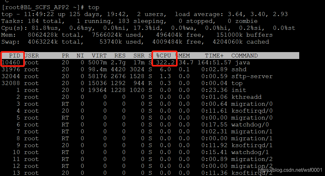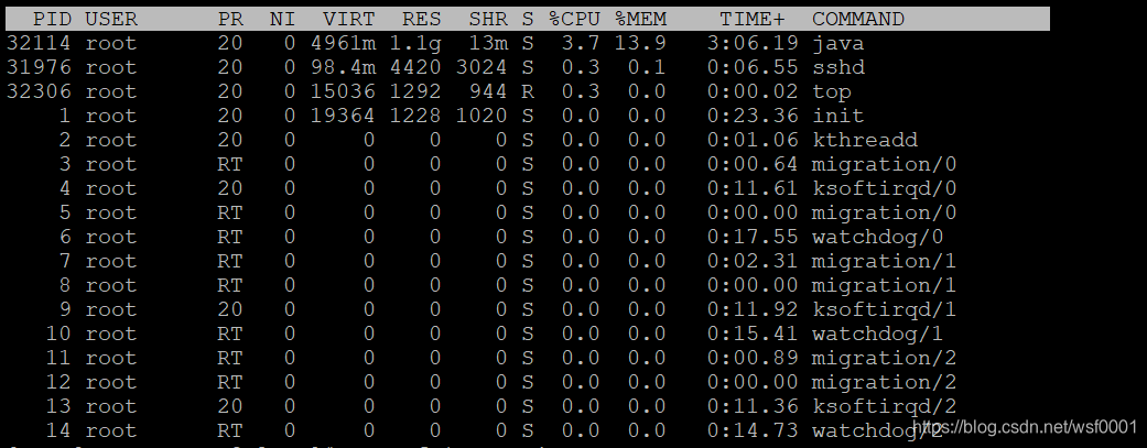 5.linux中使用命令:top检查服务器运行是否正常,如下图1为不正常状态,图2为正常状态:
