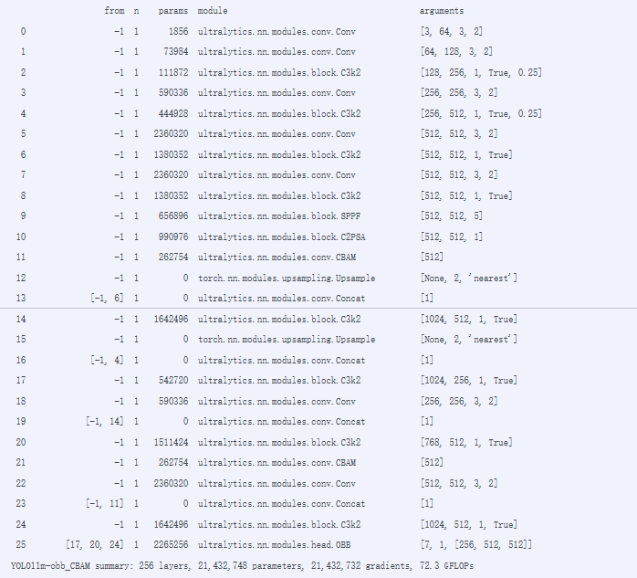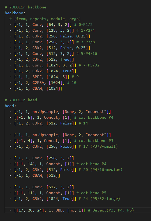 修改配置文件,复制一份yolov11-obb.yaml文件,命名位yolov11_CBAM.yaml文件