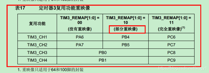 如tim3 TIME3_REMAP[1:0]=0 则使用 PA6 PA7 PB0 PB1