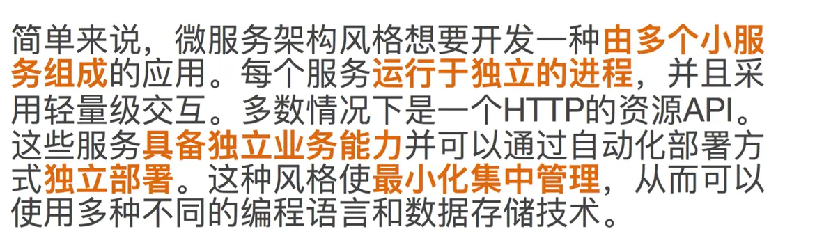 下面这个图,也是上次给公司内部培训PPT上的,我觉得可以能好的概括出何为微服务: