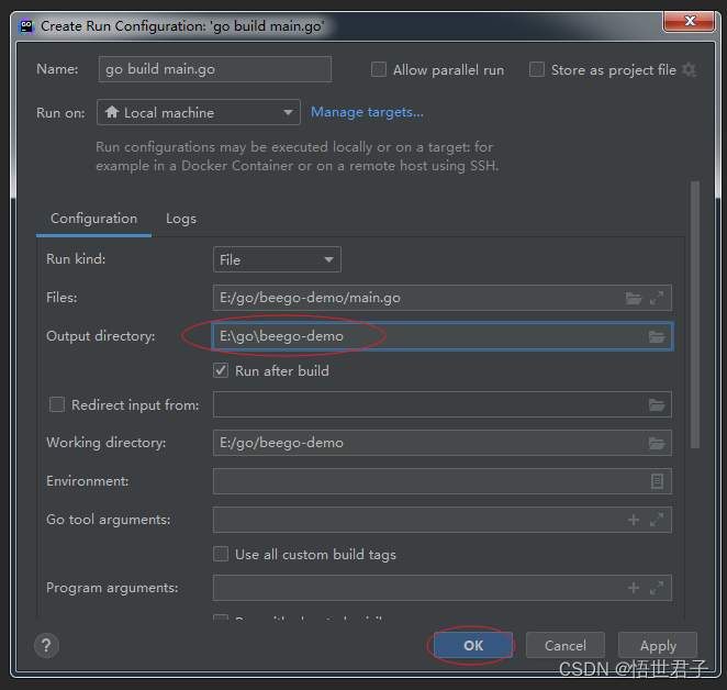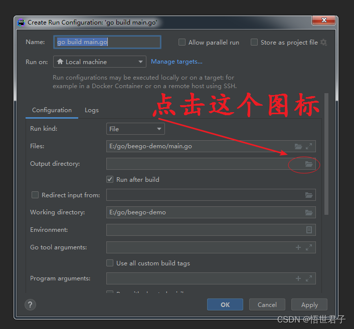 然后在 main.go 上直接右键,选择 run 'go build main.go'