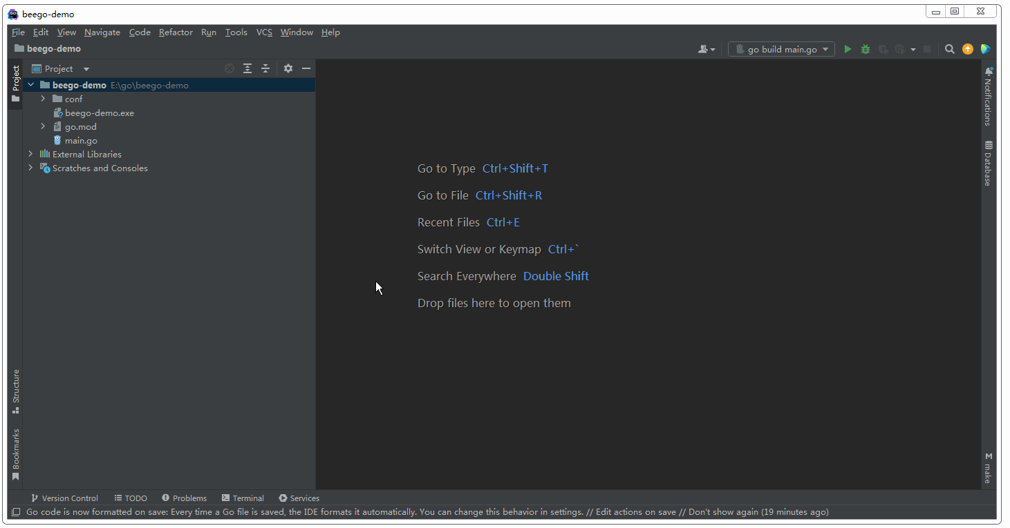 这里笔者使用手动创建 beego 项目的方式创建的项目