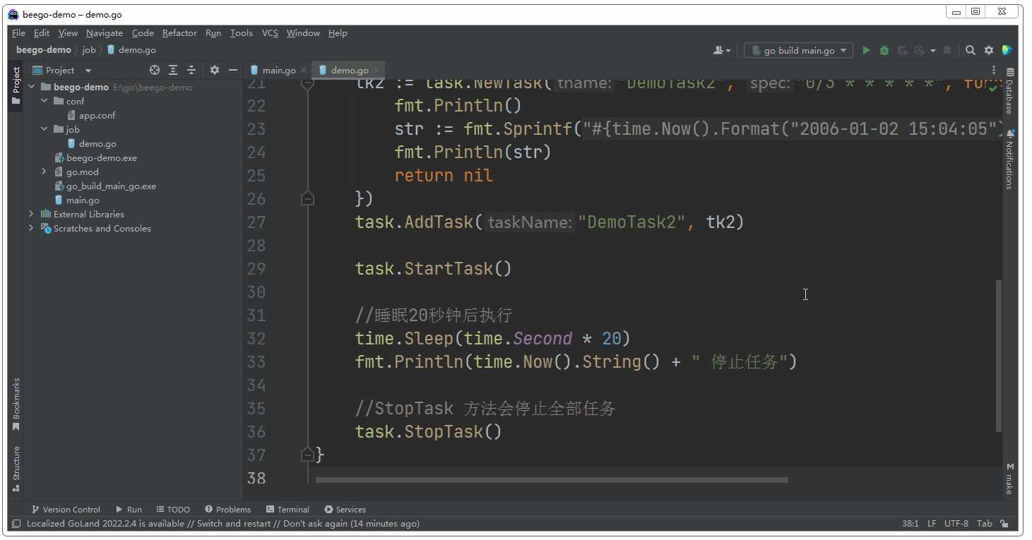 为防止 time.Sleep(time.Second * 20) 阻塞主线程,我们将 main.go 修改为下面代码