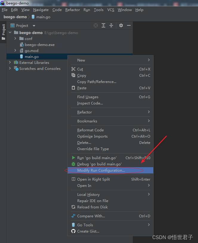 还是在 main.go 上直接右键,选择 Modify Run Configuration...
