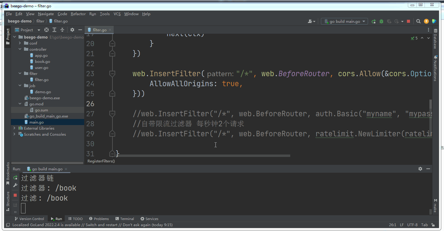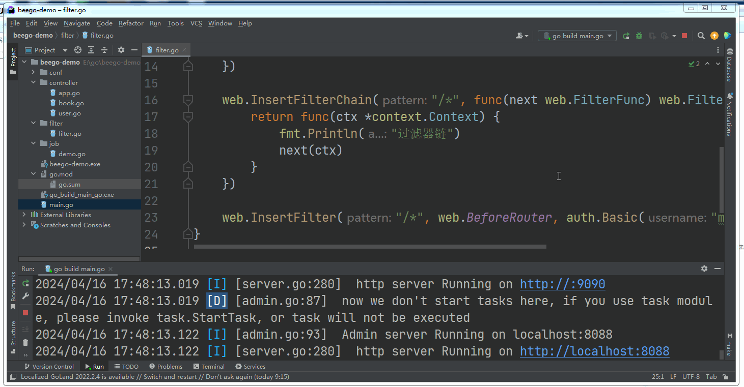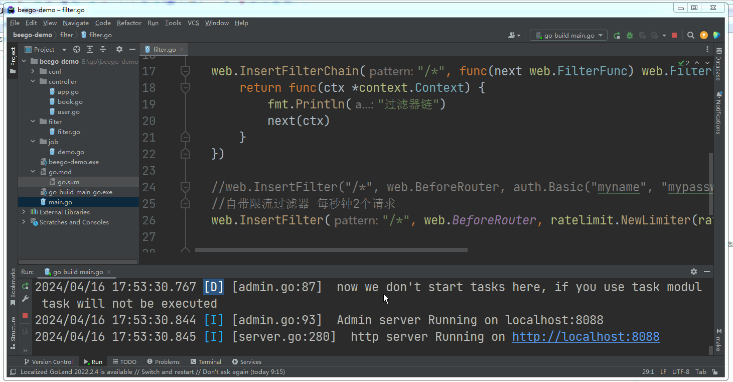 beego 提供了很多内置过滤器,如请求验证过滤器、限流过滤器等等,这些过滤器内在逻辑 beego已经实现完了,我们想用的话直接添加即可