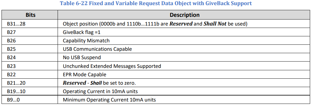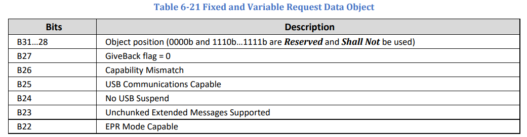 发送完Source_Capabilities之后,等待收到SINK发送的Request。接收到Request之后解析Request Message里面的数据包,数据包结构如下: