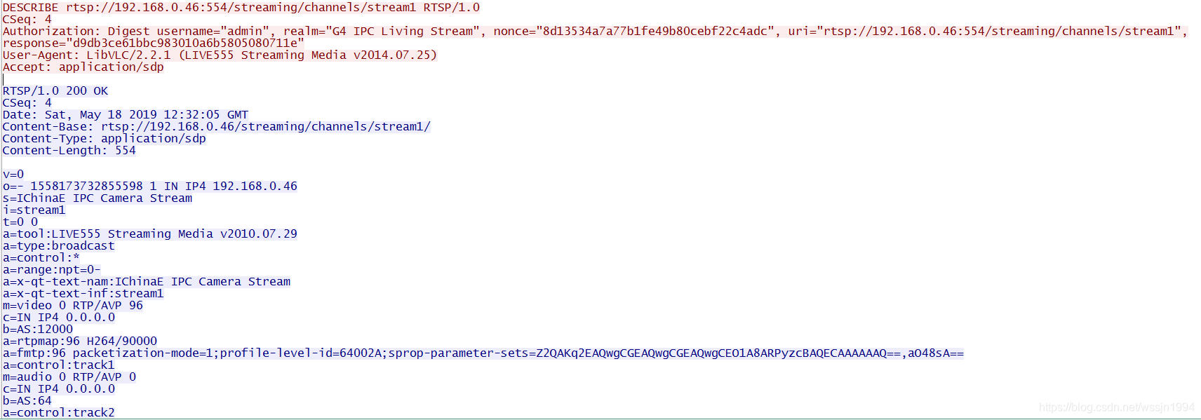 1.describe方法若有鉴权,则服务端会收到两次descibe,第一次是不带鉴权的,服务端以realm和nonce质询,第二次describe若鉴权通过,则返回sdp消息,注意sdp消息中不同相机的组包信息不同,要根据相机而定。