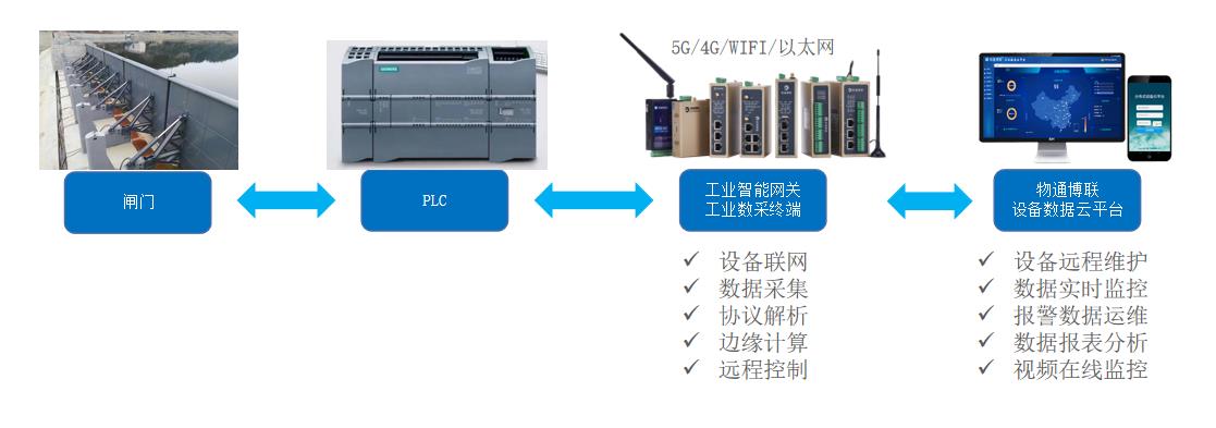 工业智能网关支持采集各类PLC、传感器、仪器仪表以及摄像头等设备数据。在泵闸站场景中,能够实时获取水泵的运行状态(如启停、转速、电流、电压等)、闸门的开度与位置、渠道的水位与流量、水质参数以及周边环境信息等。随后以5G/4G、WIFI、以太网等方式,将数据对接到数字灌区管理平台中,为多种功能应用提供全面可靠的数据支持。