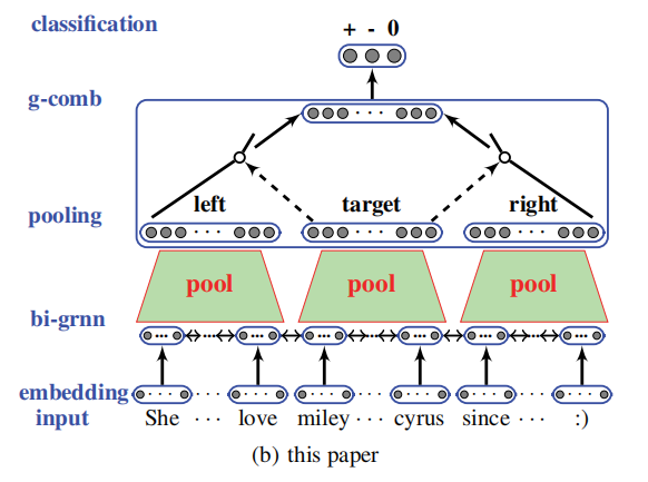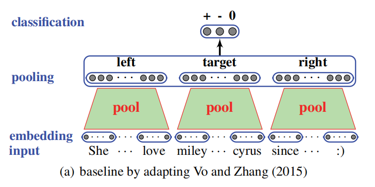 如图所示,这种方法首先用 embedding vector 表示句中每个词,之后将整句话分为 tareget 左边的 context、target、target 右边的 context 三部分。之后将每部分都做一个 pooling 的操作得到各自的向量表示。最后将这三部分的 vector 拼接起来作为整句话的表示,以此得到最后的分类结果。