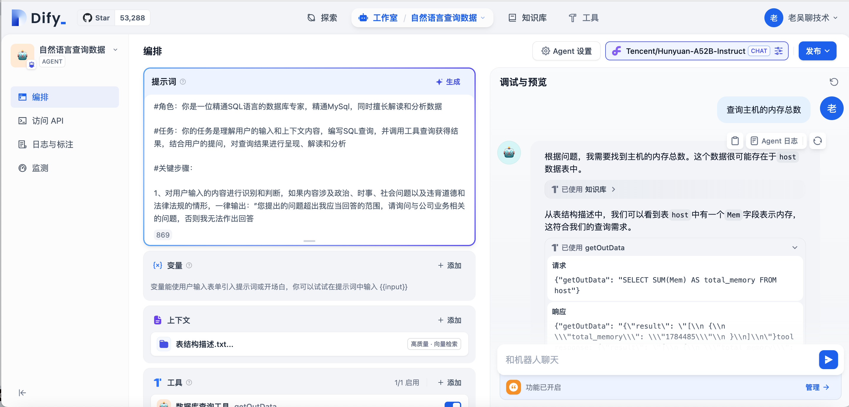 3.3. 创建Agent,输入提示词,知识库,选中数据库查询工具,大模型选择闭源大模型