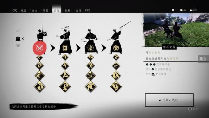 类似的符号还有不少。在竹场斩竹以增加决心值(游戏中的“决心”相当于血瓶与蓝条的结合体,用来补血和施放特殊技能),泡温泉以提升生命值上限,写俳句以获得装饰头带,收集战旗以换取马鞍,寻找蟋蟀以学习新曲谱,在“荣誉之柱”收集刀装,在不同环境下与浪人们决斗——每一项看上去都非常“日本”,而且对主角的旅程有所帮助(至少有外观上的帮助),但每一项的运用也都简单直接,玩家仅需轻松操作就能从中获得乐趣和收益。