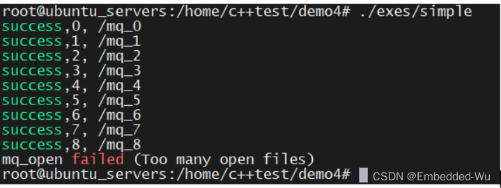 总字节数里被mq_treesize占用了一部分,因此当RLIMIT_MSGQUEUE的值为819200字节时,单个用户是无法创建出10个默认属性的消息队列的。