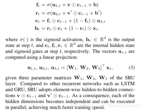 相比LSTM以及GRU,SRU可以达到更快的训练速度,SRU的变种在[33][34][35]都取得了很好的效果