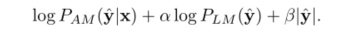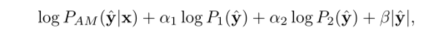 从单程波束搜索解码器获取N个最佳假设的转录后,我们使用外部字级GCNN LM和Transformer LM来评估它们的对数概率,分别表示为logP1(y)和logP2( ˆ y)。然后,我们根据以下得分进行重新排序以对假设进行重新排序: