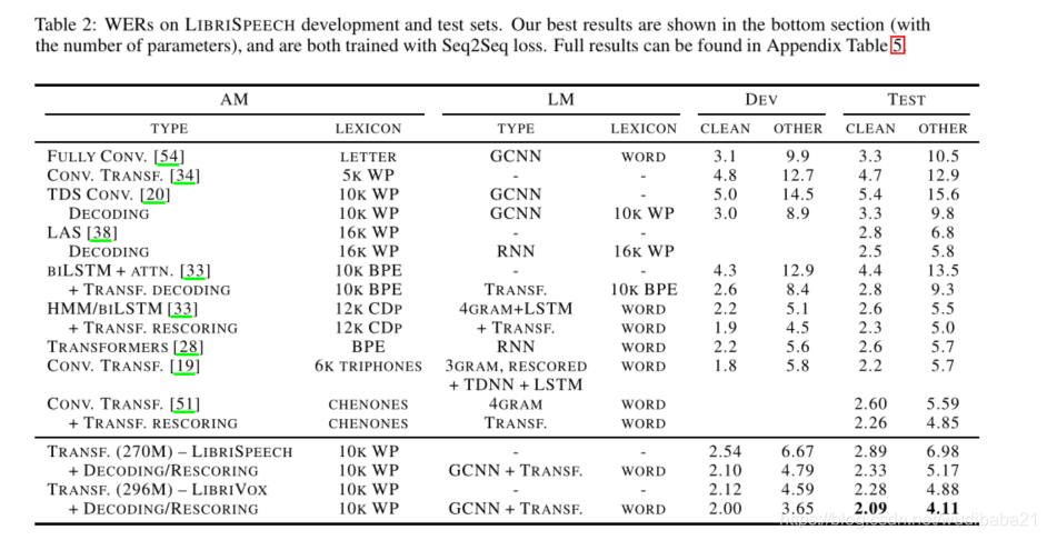 LIBRIVOX:在此组合数据集上对同时具有CTC和Seq2Seq损耗的变压器AM进行了为期5天的训练,无需解码或使用LM即可在测试清洁度上获得WER(其他为4.88%和2.28%),甚至在使用LM的管道中也是如此。解码/记录的结果显示在表2中,其中我们在清洗测试和其他测试上分别达到2.09%和4.11%,并且是对最新技术的进一步改进