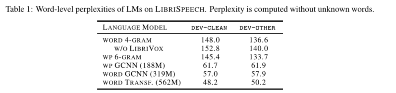 n-gram LM使用KenLM工具包进行训练,而GCNN和Transformer LM使用fairseq工具包进行训练。单词级4元gram和GCNN的训练方法与[32]相同。我们还训练了一个6gram单词的LM,其上下文大小与单词级4 gram LM相似,并且修剪了5 gram出现一次,出现6 gram出现两次或更少。单词块和单词级GCNN模型在8个GPU上使用Nesterov加速梯度下降[35]在22个时期进行训练,逐步学习率调度从1开始,当损失稳定时降低5倍。以下[12]使用梯度削波和权重归一化。单词级Transformer LM在128个GPU上进行Nesterov加速梯度下降训练,历时100个历元,平方根成反比。在前16000次迭代中,使用了将学习率从0线性增加到1的预热时间表。表1列出了所有LM变体的词级困惑。