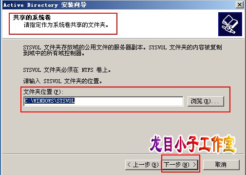 此时弹出“共享的系统卷”向导页,在此指定SYSVOL 文件夹的位置,SYSVOL 文件夹必须存放在NTFS 分区内,否则安装无法进行。设置好后,我们单击“下一步”,继续……