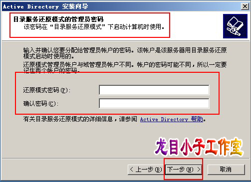 此时弹出“目录服务还原模式的管理员密码”向导页。在此需要指定“目录服务还原模式”下的管理员密码。